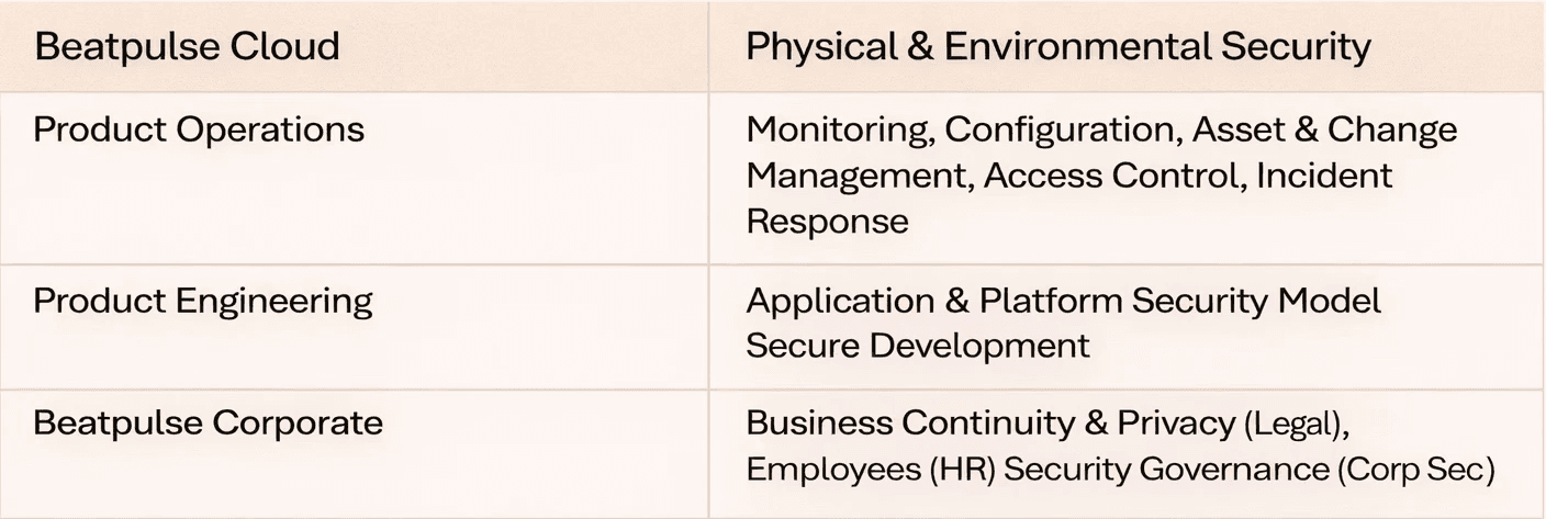 Corporate security controls are inherited across BeatpulseLabs, while functional areas (such as engineering and operations) are responsible for specific security control families, as seen in figure 1 below. The security of BeatpulseLabs products and services is overseen by the Chief Information Security Officer (CISO)- Products, who leads BeatpulseLabs's Software Security & Privacy team. This team is embedded within product operations and engineering, providing security guidance and validation while fostering a security & privacy champion program across the broad spectrum of product teams to help further embed security and privacy across BeatpulseLabs products.